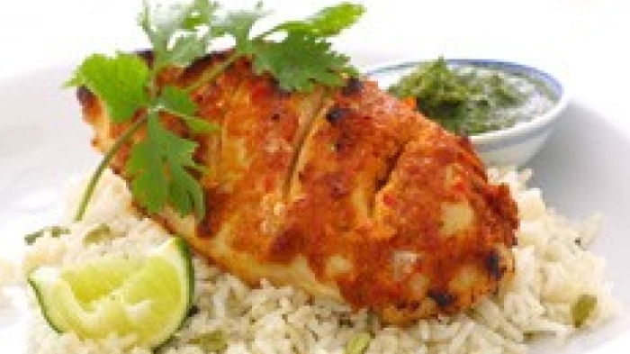 Place the dish on a high shelf and cook for 30 minutes, basting with the juices from time to time. Serve the chicken with the Spiced Pilau Rice with Nuts and the coriander chutney, garnishing with sprigs of coriander and some lime quarters to squeeze over.