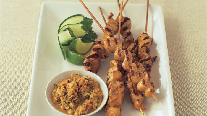 All the above can be done well in advance, but before you cook the satays, don't forget to soak the bamboo skewers in warm water for about 30 minutes. Then, when you're ready to cook the chicken, pre-heat the grill to its highest setting for at least 6 minutes.