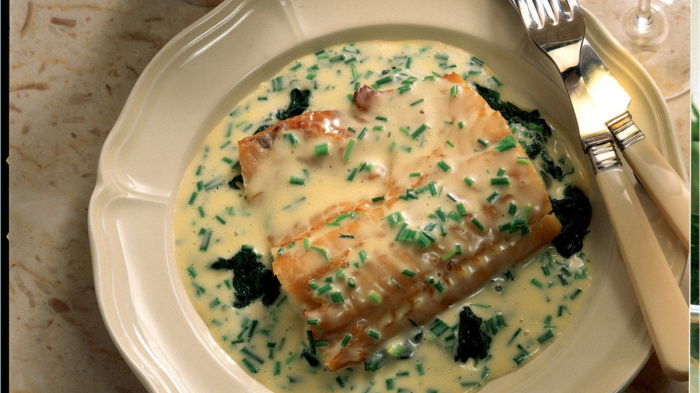 When the haddock is ready, divide the spinach between 4 warm serving plates, and place the haddock pieces on top. Now just add a little of the poaching liquid (about 2 tablespoons) to the sauce and whisk it in along with the chives, then pour the sauce over the haddock and spinach. Serve straight away.
