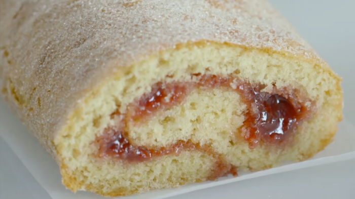 While it’s cooking you can prepare everything for the rolling operation. First of all you need a damp tea towel spread out on a flat surface (and a second one ready for later), then on top of the tea towel you place a sheet of baking parchment that’s about 2.5cm larger than the tin. Then sprinkle caster sugar all over the paper. As soon as the Swiss roll is cooked, lift it out holding the sides of the liner and turn it onto the paper immediately. Now carefully and gently strip off the liner, take a sharp knife and trim 3mm from all round the cake. This will make it much neater and help to prevent it from cracking. Cover with a clean damp tea towel and leave for a couple of minutes, then remove the damp cloth and spread the cake with jam. Then with one of the shorter edges of the cake nearest to you, make a small incision about 2.5cm from the edge, cutting right across the cake, not too deeply; this will help you when you start to roll.