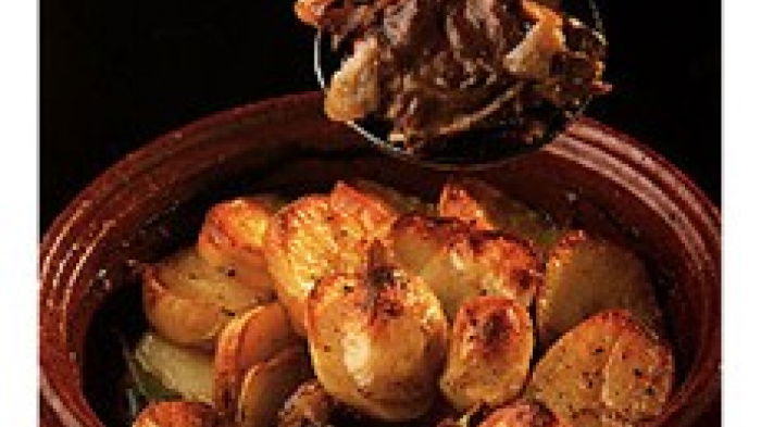 Cover with a tight-fitting lid and cook near the top of the oven for 1½ hours, then remove the lid and cook for a further 50 minutes.I sometimes finish off the hotpot under the grill. If you brush the potatoes with a little more butter and place the casserole under a hot grill they crisp up and brown beautifully. Alternatively, if you think they're not browning enough during cooking, you can turn the heat in the oven right up during the last 15 minutes. Remove the bay leaf and thyme sprigs before serving.
