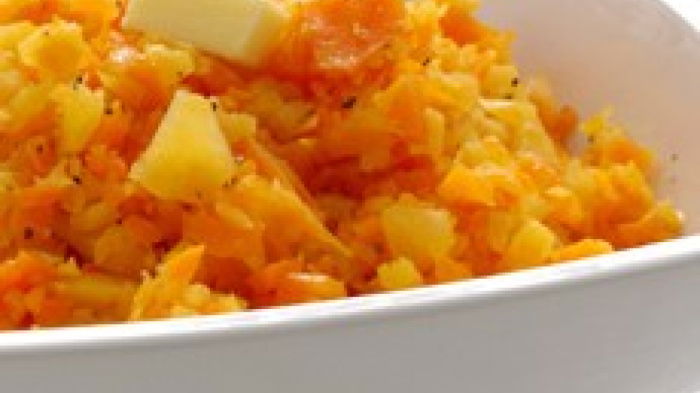 The combination of finely chopped swede and carrots with a little butter and coarsely ground pepper is colourful and very good.