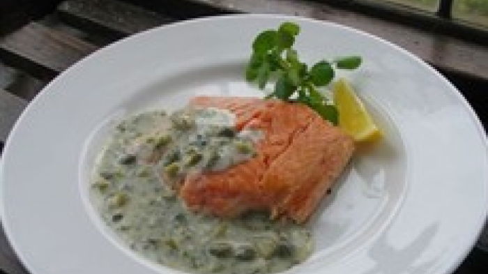 Meanwhile chop the cornichons roughly (to about the same size as the capers – the best way to do this is cut them in half lengthways, then holding the two halves together cut them in quarters lengthways ways then chop along the length), then add these along with the capers and the rest of the dill to the sauce. Stir in the crème fraîche. The salmon steaks need to be placed on a lightly greased baking sheet, seasoned with salt, freshly-milled pepper and a pinch of cayenne and warmed through in the oven for 10 minutes.