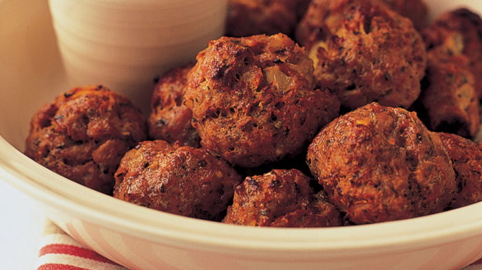 If you don't have a processor, grate the onion and apple and mix the ingredients together with a fork. Now divide the the mixture into 16 and shape into rounds so you end up with 16 rissoles. All this can be done in advance, and the rissoles can be covered and chilled in the fridge.