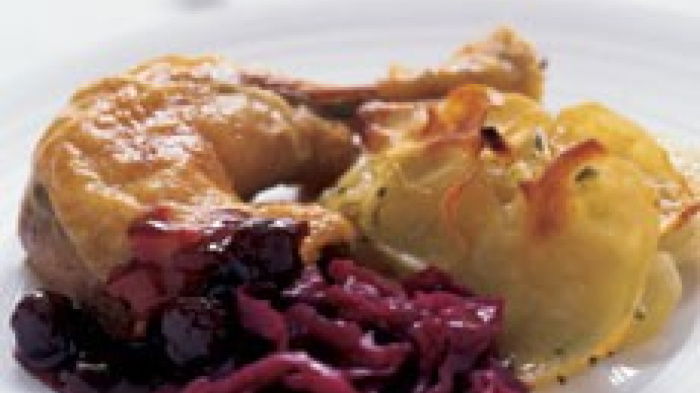 Now put little flecks of butter all over the top and place the dish on the highest shelf of the oven for 1 hour, by which time the top will be crisp and golden and the underneath creamy and tender.
