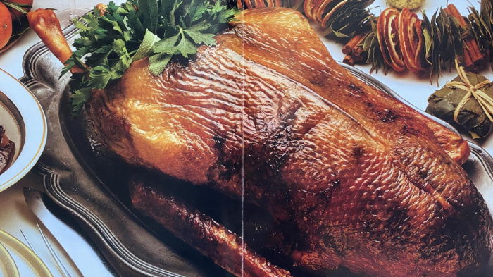 Then pack the rest of the stuffing in the body cavity. Season the goose with salt and freshly milled black pepper, lay it on a rack in the roasting tin (no need to add fat as there will be plenty inside the goose), then place the roasting tin in the centre of the pre-heated oven. Give it 30 minutes' cooking initially, then reduce the temperature to gas mark 4, 350°F (180°C), and roast for another 3 hours for a 11 lb (5 kg) goose plus stuffing: allow 15 minutes less for a 10 lb (4.5 kg) bird; 15 minutes more for a 12 lb (5.4 kg) one.