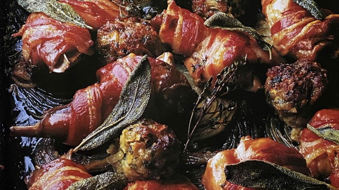 This is how I remember my mother cooking rabbit: roasted on a bed of onions covered with crisp bacon, and rows of savoury stuffing cooked alongside.