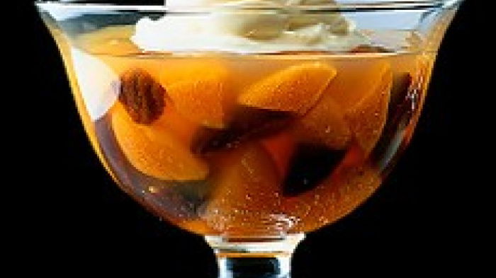 Meanwhile, remove the zest and cinnamon from the fruit, discard these, then cut each apricot and prune into roughly ½ inch (1 cm) pieces. When the jelly is about to set, remove it from the fridge and fold in the fruit. Then ladle it into the glasses and give each one a quick stir with a fine skewer to distribute the pieces of fruit as evenly as possible, so that they don't all stick together in the base of each glass. Now cover the glasses with clingfilm and return them to the fridge until needed.