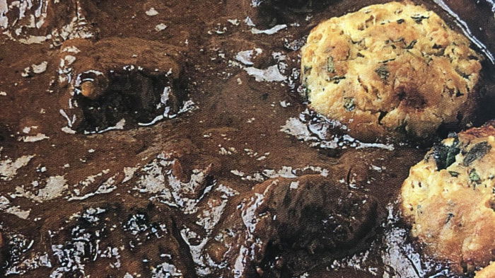 Now spoon the steak and kidney into the pre-heated pie dish or baking dish, then pop the dumplings on top and place the whole lot in the oven on a high shelf for 25-30 minutes or until the dumplings are cooked underneath and brown and crunchy on top. If the casserole you're using is a shallow one, you can dispense with the baking dish and pop the dumplings straight in.
