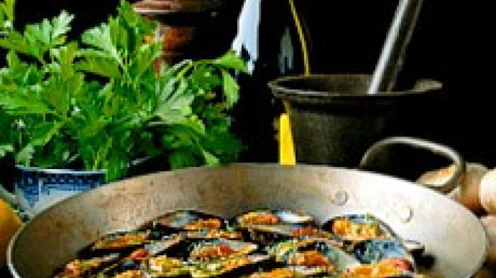 Next, in a basin combine the butter, garlic, lemon juice and chopped parsley together with the reduced mussel cooking liquid. Then season well with salt and freshly milled black pepper. Now put a blob of the butter mixture on to each mussel, place the baking sheet on the top shelf of the oven and cook for 5-8 minutes, or until you hear the butter sizzling nicely. Serve them absolutely immediately on warm plates with lots of crusty baguette to dip into those wonderfully flavoured juices.