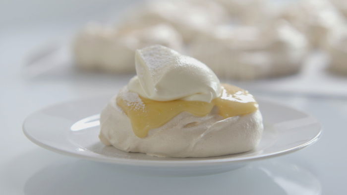While the meringues are cooking you can make the lemon curd: place the grated lemon zest and sugar in a bowl, whisk the lemon juice together with the eggs, and pour this over the sugar. Next add the butter cut into small pieces, and place the bowl over a pan of barely simmering water (making sure the bowl does not touch the water). Whisk every now and then until thickened, which should take about 20 minutes. Then leave it on one side to cool.