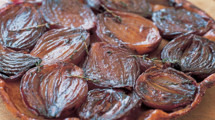 Then return the tart to the oven on the same baking sheet but this time on the higher shelf and give it another 25-30 minutes until the pastry is crisp and golden. When the tart is cooked, remove it from the oven and allow it to cool for 20 minutes before turning it out. When turning it out it's important to have a completely flat plate or board. Then, protecting your hands with a tea cloth, place the plate on top of the pan, then turn it upside down, give it a good shake and hey presto – Red Onion Tarte Tatin!