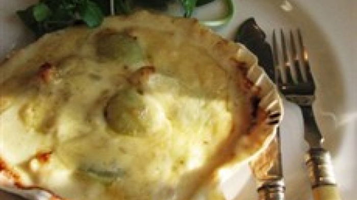 Next melt the butter in a saucepan then stir in the flour till smooth. Now add the scallop liquid a little at a time, stirring the whole time till you have a smooth sauce. Season with salt and pepper and continue to cook very gently for another five minutes or so. Pre-heat the grill at this point, at its highest setting, for ten minutes. Take the pan off the heat then add the whites and the corals, along with the cream. Give it a stir then bring back to heat, being careful not to let it boil. Divide the mixture between the scallop shells or gratin dishes, then pop them under the grill (four inches from the source of the heat)for 2-3 minutes till browned and bubbling. to brown a little.