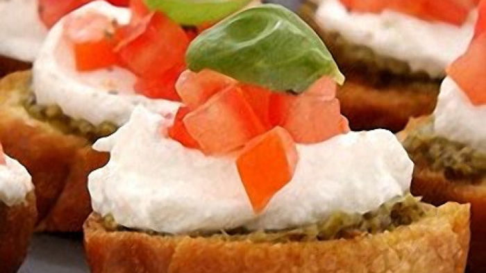 Cool them on a wire rack and store in an airtight tin until you need them (they will be okay for up to 2 weeks, which is very helpful). When you're ready to serve, skin the tomatoes by pouring boiling water over them, leave for 1 minute, then halve them, scoop out the pips, slip off the skins and chop the flesh into tiny dice. Now simply spread each crisp bread slice first with a thin layer of pesto, then with a generous layer of goats' cheese, and sprinkle on the diced tomato together with a little crushed sea salt and coarsely ground black pepper. Finally, using a small teaspoon, add a few droplets of olive oil – though be careful not to overdo this.
