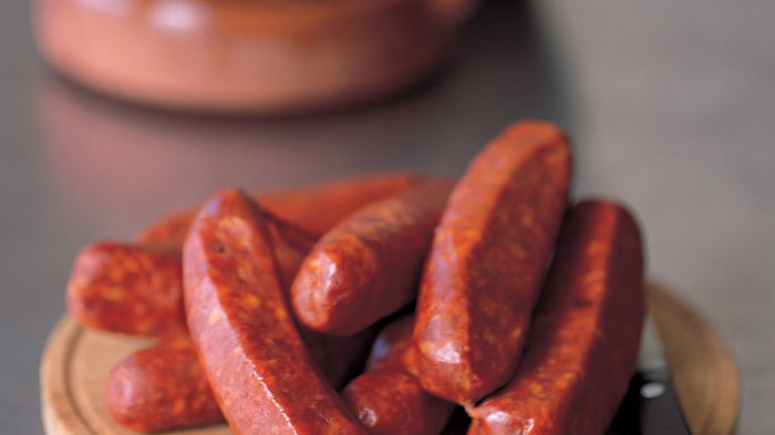 Our local, award-winning pork farmers, Ian and Sue Whitehead at Lane Farm, Suffolk, now include in their excellent range of sausages something rarely seen outside Spain, in the shape of semi-dried, lightly smoked chorizos, fragrant, spicy and quite sublime. These can be ordered by mail and freeze well if you want to stock up. But failing that, this recipe will work with normal dried chorizo.