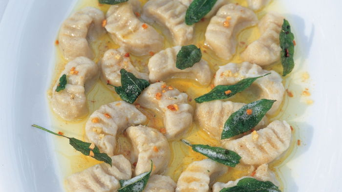 When they are ready, remove the gnocchi with a draining spoon and transfer them to the warm serving dish. For the sauce, melt the butter with the garlic over a gentle heat until the garlic turns nut brown in colour – about 1 minute. Next add the sage leaves and allow the butter to froth while the sage leaves turn crisp – about 30 seconds – then spoon the butter mixture over the warm gnocchi. Sprinkle half the Parmesan over and serve the rest separately. For more Italian recipes why not watch our Cookery School Video for Perfect Pasta on this page.