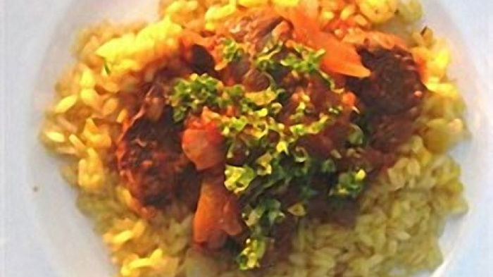 When the time’s up, take off the lid and continue to simmer very gently for a further hour (do keep an eye on it because it mustn’t reduce too much) until the meat is tender. Before serving mix the chopped garlic, parsley and lemon zest together and sprinkle this mixture equally over each serving.