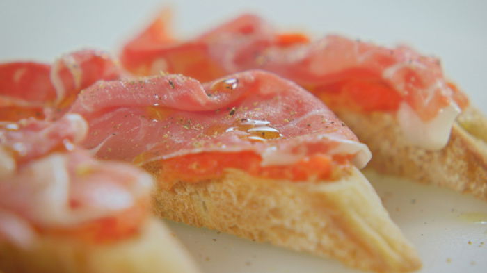 Then press out the excess liquid from the tomato pulp with the back of a tablespoon. Next toast the bread lightly on one side (about 10cm from the grill), then spread the tomato pulp on the untoasted side. Top with slices of Serrano or Ibérico ham. Followed by a few drops of olive oil and some freshly milled black pepper.