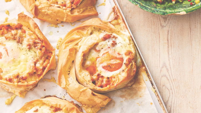 2. Drain the beans, toss with the harissa, tomato purée and ½ a tablespoon of red wine vinegar, then divide evenly between the filo nests. Crack an egg onto each one, season with sea salt and black pepper, grate over the cheese, then divide and sprinkle over the sesame seeds. Bake for 15 minutes, or until golden and crisp.