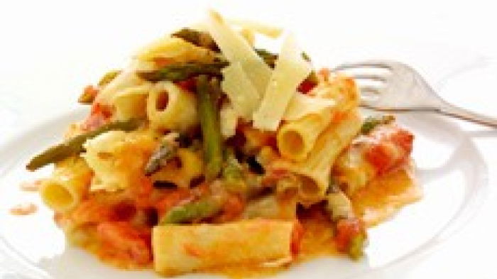 Prepare the asparagus by cutting the stalks diagonally into pieces roughly the same size as the rigatoni. Then take a 9 inch (23 cm) frying pan, heat up the oil in it and sauté the asparagus pieces for about 5 minutes, tossing them around the pan and keeping the heat fairly high so that they colour at the edges. Then add the tomatoes to the pan, and let them bubble and reduce for about 1 minute. Then turn the heat off.. You can also watch how to peel and de-seed tomatoes in our Cookery School Video on this page.