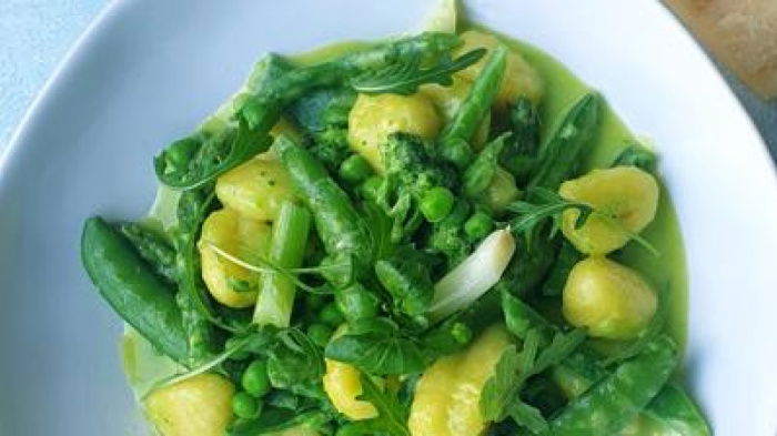 This is a perfect recipe for the start of spring and can also become your super standby because you can make it entirely with frozen peas. Otherwise, the vegetable mixture is a little of what you fancy combined with what is freshest and best. The puree gives the dish a creamy texture without adding any cream. The best way to check if green vegetables are ready is to have a bowl of cold water next to your cooker, lift a vegetable out of the boiling water with tongs, dip it into the cold water so that you don't burn your tongue, then taste it. To lift the vegetables and gnocchi out of the water, a wire spider (so named because it looks like a spider's web) is the best option. The puree can be made and refrigerated at least a day before serving.