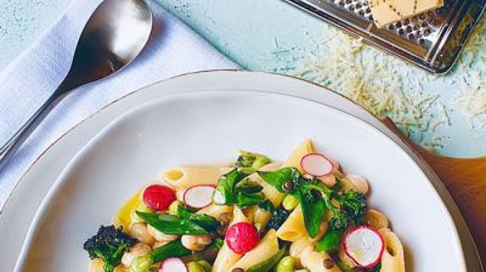 The inspiration for this recipe comes from a Calabrian dish called 'Millecosedde' and the pasta with chickpeas that my Chef Don Alfonso in Santa Agata would make for staff dinner and enthusiastically tell us 'this is better than meat'. The 'thousand things' traditionally refers to mixed beans and lentils with a little cabbage. I love the idea of basing a recipe on dried pasta and dried pulses, it feels exciting, typical of Southern Italian and French cooks' resourcefulness. I've made it simpler with frozen and tinned beans, fresher with the addition of spring vegetables and more luxurious by adding tons of Grana Padano. Feel free to vary the pulses, beans and vegetables as much as you like. I couldn't resist adding a few radishes for a flash of red and a crunchy touch.