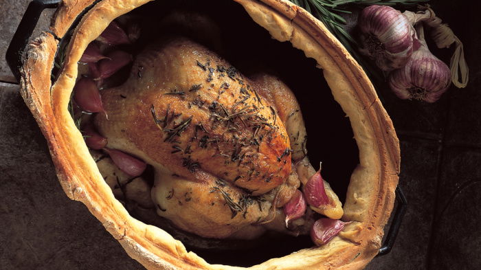 After that, remove the chicken from the casserole, add the cloves of garlic and rosemary sprigs, toss these around, then replace the chicken and sprinkle the chopped rosemary all over. Next, pour the wine all around it and let it gently come up to simmering point. Meanwhile, place the flour in a bowl and add 5 fl oz (150 ml) cold water – it should be enough to make a soft but not sticky dough – then divide the dough into 4 and roll each piece into a cylinder about 9 inches (23 cm) long on a lightly floured surface. Now position these all around the rim of the casserole – it doesn’t matter what they look like. Place the casserole lid carefully on top, pressing down gently and making sure there are no gaps. Alternatively, simply place a double sheet of foil over the casserole before putting the lid on. Now place the casserole in the oven and cook for 1¼ hours, then remove the lid and let the chicken continue to cook for another 10 minutes, to re-crisp the skin. Next remove the chicken from the casserole and allow it to rest for 10 minutes before carving.