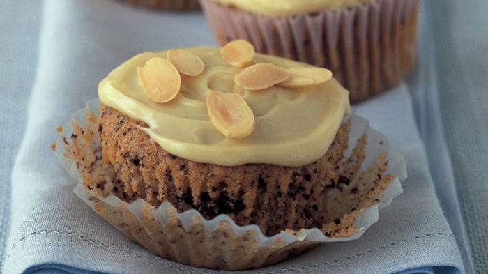 To decorate, melt the white chocolate in a heatproof bowl over a pan of barely simmering water, making sure the bottom of the bowl doesn't actually touch the water. Remove the bowl from the pan and leave to cool for about 5 minutes, then stir in the liquid glucose. Now spread a little of the icing on top of each cupcake and decorate each with a few toasted almonds.
