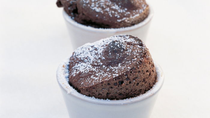 Now, in a small bowl, whisk the egg yolks thoroughly and stir them into the chocolate mixture. Then, in another, large, grease-free bowl – and making sure the beaters of your electric hand whisk are clean and dry – whisk the egg whites until they form stiff peaks. You can also watch how to whisk egg whites in our Online Cookery School on this page. Then, using a metal spoon, fold a quarter of the egg white into the chocolate mixture to loosen it and then fold in the rest gently and carefully. Next, pour the whole lot into the ramekins and bake on the baking tray for about 10 minutes, or until the soufflés are puffy and springy to the touch.