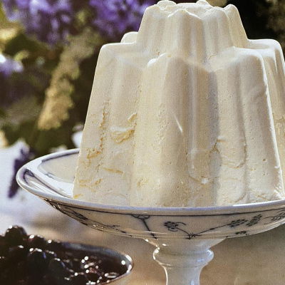 To make the cappuccino sauce, heat the milk and sugar in a small saucepan, then whisk in the espresso powder once the mixture is hot. Then remove it from the heat and allow it to cool before pouring it into a mixing bowl, then add the cream. Now beat the mixture until slightly frothy and beginning to thicken, then leave it to stand for about 5 minutes while you unmould the chocolate creams. (You can make the sauce up to 4 hours ahead and store it, covered, in the fridge.) To do this, ease the cream away from the edge of the pudding basin with your little finger, then invert the basin on to a plate and give it a really hefty shaking. Using a draining spoon, lift some of the cappuccino 'froth' off the top of the sauce and place a spoonful on top of each cream, then pour the remaining thinner sauce around each plate.
