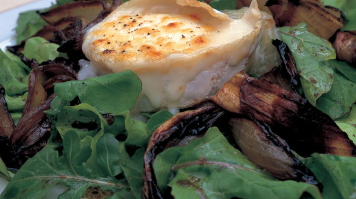 While they're grilling, arrange some lettuce leaves on each serving plate and divide and scatter the rocket between them. Then, when the cheese is ready, place one in the middle of each plate, scatter the onion all round and, finally, drizzle the vinaigrette dressing over each salad. Needless to say, lots of crusty bread should be available.