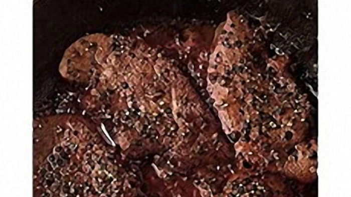 When you've got the peppercorns coarsely crushed, add them to the flour with the salt. Then dip the pieces of liver in it, pressing the pepper in a bit on both sides. Now in a large heavy-based frying pan, heat the oil and butter to the foamy stage, then put the liver slices in and cook them gently for a minute or two. As soon as the blood starts to run, turn them over, and gently cook them on the other side for slightly less time. Whatever you do, don't overcook the liver or it will be dry and tough.