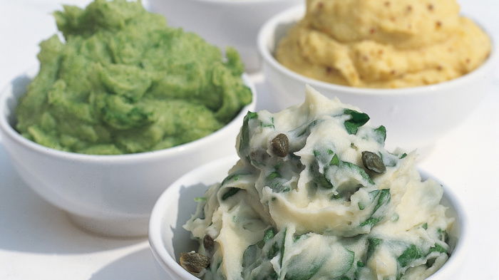 When the potatoes are tender, drain them, return them to the hot pan, cover with a clean tea cloth and leave for 4 minutes, then add the butter, milk and crème fraîche. Now, using an electric hand whisk, begin to whisk slowly to break them up, then add the watercress, increase the speed of the whisk and continue whisking until the potatoes are smooth and fluffy.