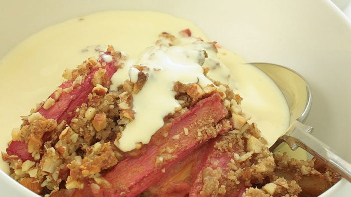 Now bake the crumble on the centre shelf of the oven for 35-40 minutes, by which time the rhubarb will be soft and the topping golden brown and crisp. Leave it to rest for 10-15 minutes before serving, then serve it warm with custard, pouring cream or ice cream.