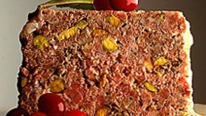 When the mixture begins to simmer, turn the heat down to its lowest setting and let it just bubble very gently for about 25 minutes without a lid. The mixture should end up reduced and thickened but with the cranberries still retaining their shape.Leave the compote to cool, then cover and chill. About an hour before serving, take the terrine out of the fridge then serve it cut in slices with the compote.