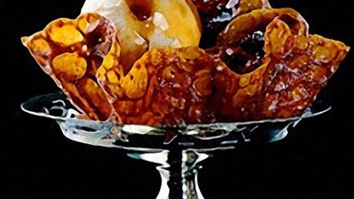 Now place 2 tablespoons of the mixture on the baking parchment so that you have 2 circles on the tray, allowing space for them to spread to a 7 inch (18 cm) diameter as they cook. Now place them in the oven and bake for 8-10 minutes, keeping your eye on them for the last 2 minutes of the cooking time. Remove from the oven and allow them to cool for 2 minutes before lifting one from the tray and moulding it over the upturned, greased jam jar, pressing the edges out to get a frilly basket shape. If they get too cool to mould, don't worry about it – just pop them back in the oven for 1 minute and then try again. If you are unsure of yourself, you can have several goes, but remember, it's much easier than it sounds.