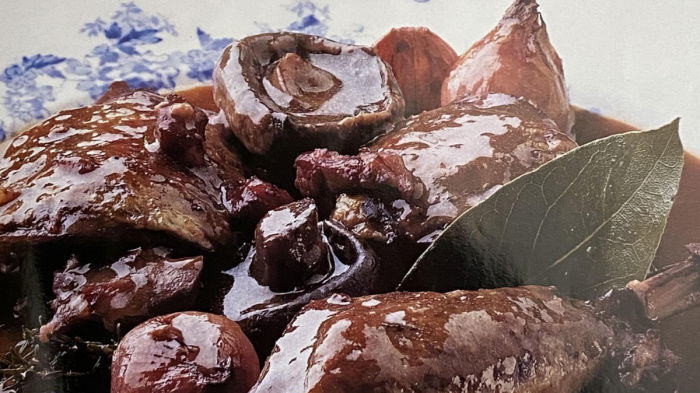 After that, add the mushrooms (whole if they are not too large, otherwise chopped) and continue to cook for another 15 minutes. Then remove the guinea fowl, pancetta, shallots and mushrooms to a warm serving dish and keep warm. Now discard the herbs, bring the liquid in the casserole up to a fast boil and reduce by about one third. Next, mix the arrowroot to a paste with a little water, then add a little of the hot sauce.