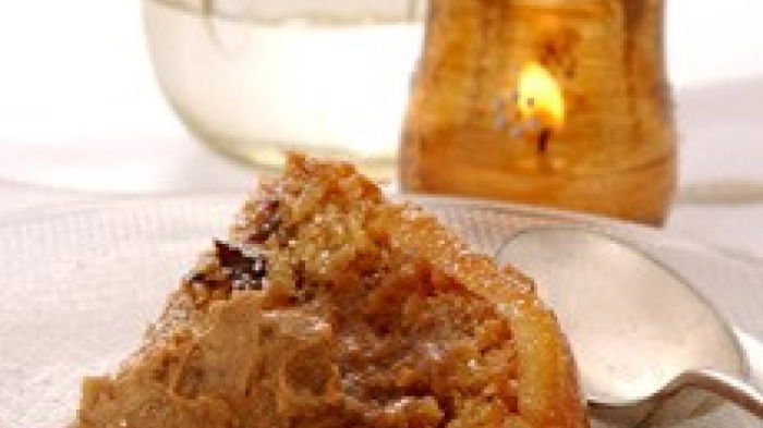 Then beat the eggs in a jug and add these a minute amount at a time, whisking well after each addition. When all the liquid egg is incorporated carefully fold in the sifted flour, mace and salt, followed by the lemon juice, grated lemon and orange zest, chopped apple and finally the mincemeat. Now spoon the mixture into the basin, being careful to leave your artistic arrangement intact. Tie a double piece of pleated foil on to the basin, place it in a steamer over boiling water and steam for 2½ hours.