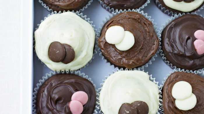 Just put the chocolate and condensed milk into another heatproof bowl and melt together (as above). Then take the bowl off the heat, stir in the butter until melted and allow the mixture to cool for about 5 minutes. Using a small palette knife, spread the mixture over the top of the cakes and finish each one with two chocolate buttons.