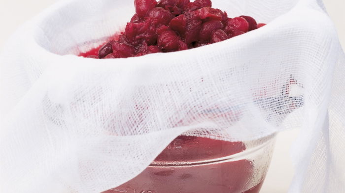 Then empty the entire contents of the pan into the sieve, lined with the muslin (or gauze) and placed over an equally large bowl or jug, and leave it to drip for a minimum of 8 hours or, preferably, overnight. Do not be tempted to press the cranberries; the juice may become cloudy, but it's important to leave it alone to drip away.