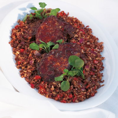 Now place all the confit ingredients in a medium-size saucepan, bring them up to a gentle simmer and leave to cook gently (without a lid) for 50-60 minutes, until the liquid has reduced to a sticky mass. (Note: if you want to make this confit in advance, just warm it through gently – it doesn’t need to be hot, just warm.)