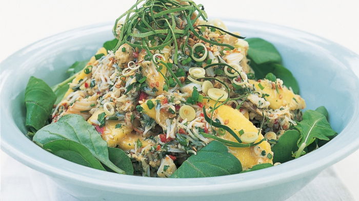 In Thailand they serve it with pomelo, which is very similar to grapefruit. When they’re not available, I use mango, but you could ring the changes with grapes or small segments of pink grapefruit.