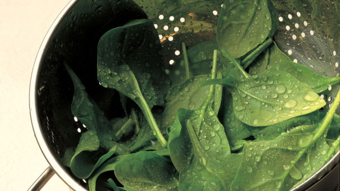 Pre-heat the oven to a low setting and put the dish in to heat at the same time. Meanwhile, cook the spinach by putting it in a large saucepan with a lid on, then place it over a medium heat. Just let it collapse into its own juices, timing it for 2-3 minutes and turning it over halfway through. Drain the spinach in a colander, pressing it with a saucer to extract every last bit of juice, then arrange it in the bottom of the dish. Season with salt, pepper and a grating of nutmeg, then cover and keep warm in the oven.