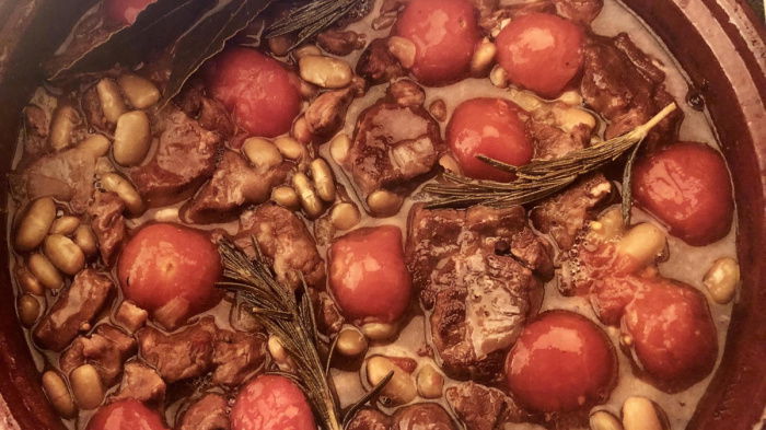 Towards the end of that time pour boiling water over the tomatoes and then, after 30 seconds, drain off the water and slip the skins off. Add these to the casserole, along with a good seasoning of salt, then replace the lid and carry on cooking for a further hour. Before serving, remove the bay leaves and sprigs of thyme and taste to check the seasoning.