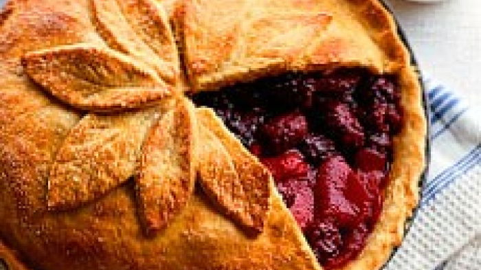 Then press the rest of the pastry over that to form a lid and, using a sharp knife, trim any excess pastry off. Use the blunt side of the knife and your thumb to press the two edges firmly together and knock the edges all round to give a layered effect. Then flute the edges by using your thumb to make an impression and the broad blade of the knife to draw in the edges of the pastry. Make a steam hole in the centre and, if you have time, make some decorative leaves with the pastry trimmings.