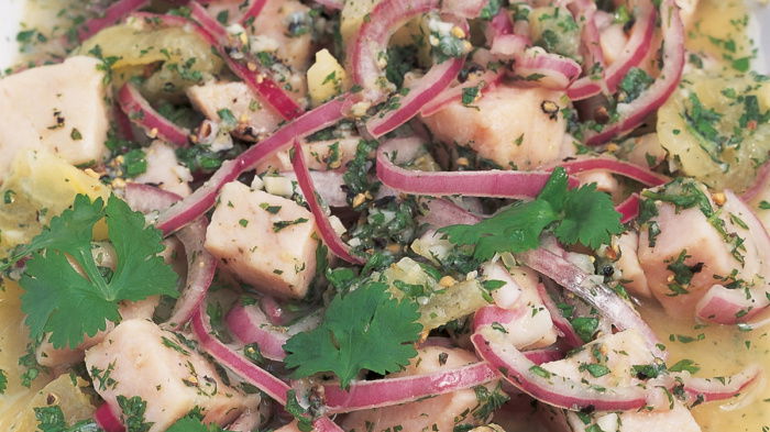 Ceviche is a dish in which fish is 'cooked' in lime or lemon juice with lots of other gutsy flavours.