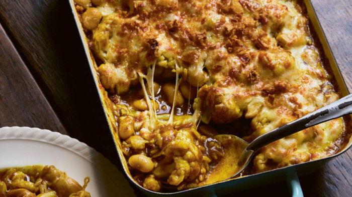 Doria are rice gratins, a yōshoku favourite dating back to the 1930s. Traditionally, they are made with white sauce, but there are also versions made with curry – a variant sometimes called yaki-curry. This recipe, using cauliflower, is what you’d get if a curry and cauliflower cheese had a baby. Great as a side dish, but with the addition of butter beans, it makes a very satisfying vegetarian main.