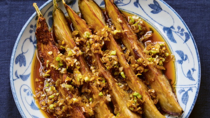 This is a common vegetarian variation of the Chinese-Japanese dish yūrinchī: fried chicken, smothered in mouthwatering sauce made from chopped leeks, ginger and a generous glug of vinegar. This recipe uses pan-fried aubergine (eggplant) instead of deep-fried chicken, which is just as juicy, moreish and flavourful.
