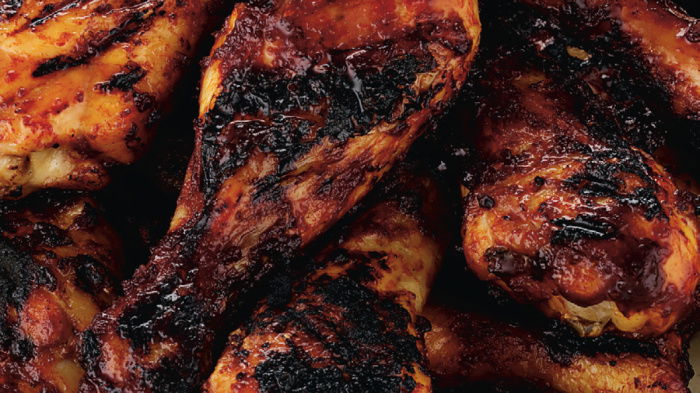 When you light the charcoal, pre-cook the chicken drumsticks for 15 minutes, then, when your charcoal is at the right heat, brush the drumsticks with the glaze and cook for about 5 minutes on each side about 3 inches (7.5 cm) from the coals.