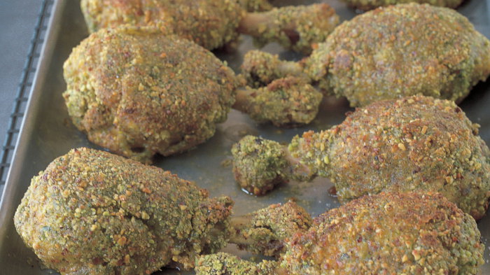 Place the nuts, coriander leaves, 1½ tablespoons of the reserved flour and the cayenne pepper in a food processor and blend until you have a mixture chopped minutely small, then transfer this to a plate. After that, beat the egg and milk together in a bowl. Then take each drumstick and dip it once more in the remaining seasoned flour, then into the egg mixture, and finally into the pistachio mixture.